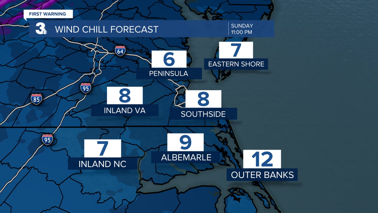 |  | Windchill values will dip into the single digits throughout Hampton Roads on Sunday night. (Photo by Derrah Getter/WTKR) | Temperatures will gradually warm up as the week continues. Highs will return to the mid-50s by Wednesday.